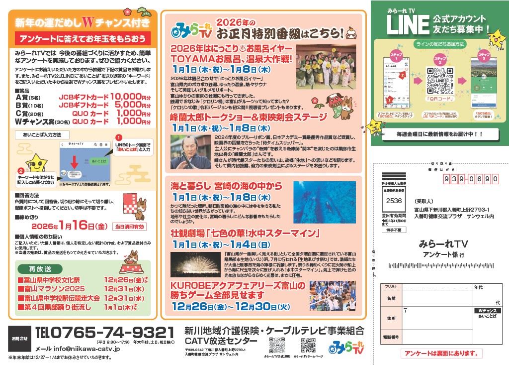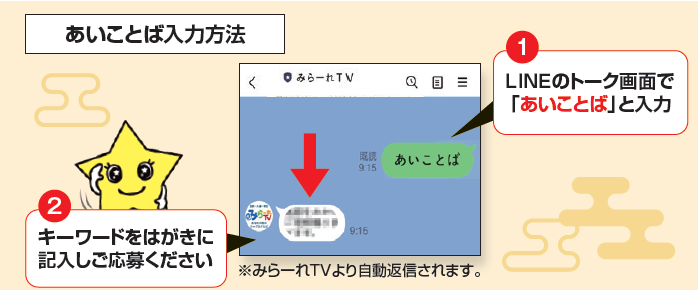 また、みらーれTV公式LINEに“あいことば”を送り、返答の「キーワード」をご記入いただいた中から抽選でWチャンス賞をプレゼントいたします。