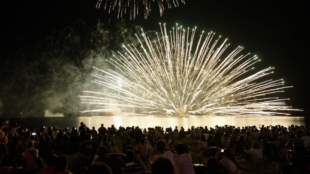 「富山湾が一番美しく見える街」として全国夕陽百選に選定されている富山県黒部市生地(いくじ)浜」。7月に行われる「生地ゑびす祭り」では、漁師たちが大漁と無事故を海の神様に祈願します。祭りの締めくくりに花火師が船上から海に尺玉を次々に投げ入れる「水中スターマイン」。海上で弾け七色の光を放ちながらきらめく光景は、まさに圧巻。
