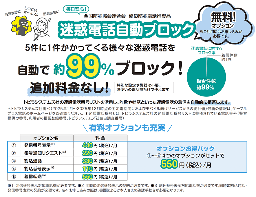 1基本料がおトク!さらに迷惑電話自動ブロックが無料!
