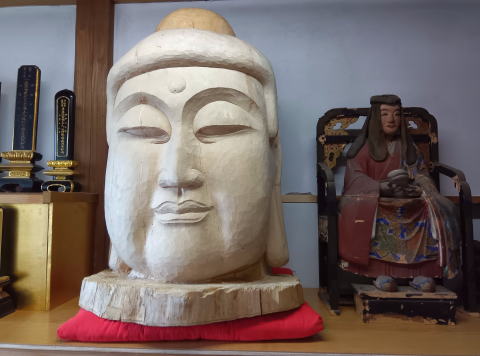 仏像製作に当たり風雪に耐えられるか管理はどうあるべきかなど種々思いを走らせました。知恩院勢至堂の「仏頭」を思い出し、仏智を現すに最も相応しいのは、「仏頭」とし銀杏の根の上に安置することと決めました。製作は誰がするのか。大本山清浄華院で木像彫刻講座を開設していることを知り、下手でも住職が心を込めて作成しようと思いました。しかし、月に数回京都へ通うことは現実的でなく指導の佛教大学前田昌宏生に製作を依頼しました。生木のためひび割れが生じ補修の上納入され、堂内安置に切り替え、位牌堂にお祀りしました。 |